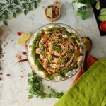 -In a deep serving bowl,add boiled chickpeas,chaat masala,red chilli crushed,prepared hari chutney, mixed vegetable salad,boiled potatoes,prepared meethi chutney,peanuts,sev nimco,prepared yogurt meethi chutney,hari chutney,papri,boiled whole green gram,chaat masala,dahi phulkiyan, yogurt,meethi chutney,hari chutney,red chilli crushed,sev nimco & serve!