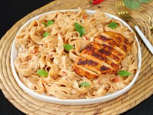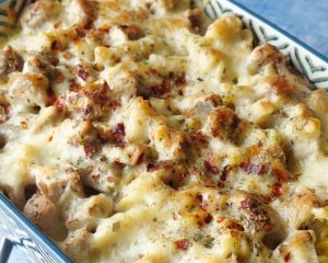 Grease baking dish with oil,add boiled spiral pasta,pour alfredo sauce,add chicken cubes and stir slightly.