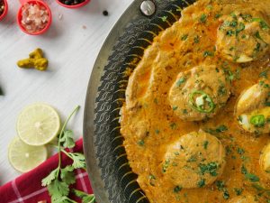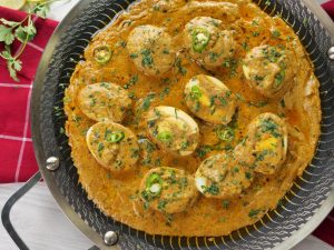 -Place halved eggs,pour gravy,sprinkle fresh coriander,green chilli,cover & cook on low flame for 1-2 minutes & serve!