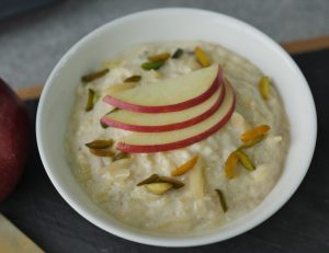 In serving dish,add apple kheer and garnish with apple slices,pistachios and almonds.