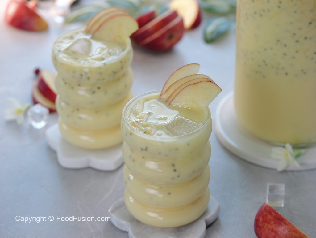 -In a large bowl,add ice cubes,milk,prepared sugar syrup,soaked basil seeds,apples (grate with the help of grater),mix well & serve!