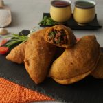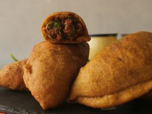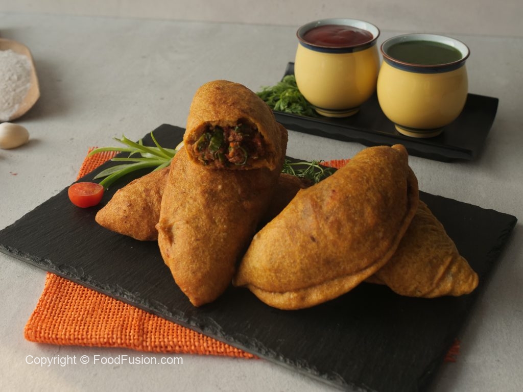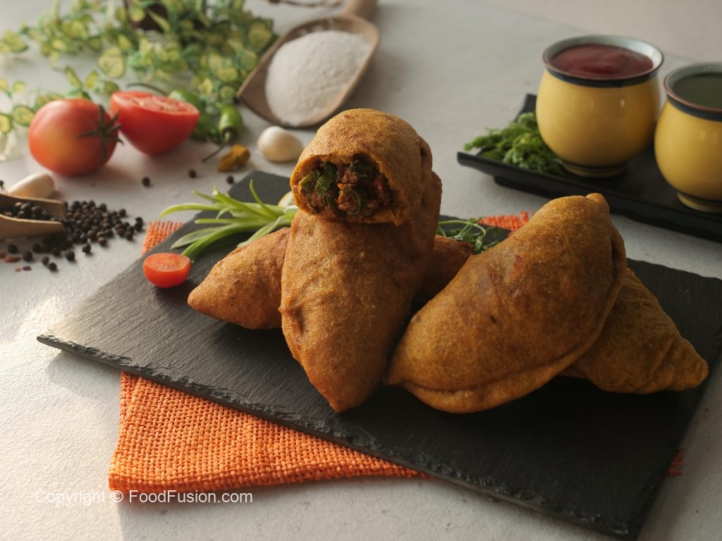 -Add prepared mince filling (2 tbs) & fold the dough with the help of wet cloth to make D-shape samosa shape (makes 8).