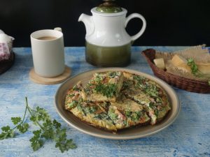 Flip the omelet on serving plate,cut into slices & serve!