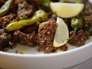 -In serving dish,add fried beef,sprinkle prepared balochi tikka masala,fresh coriander,lemon juice & mix well,cover & let it absorb the spices for 2-3 minutes.