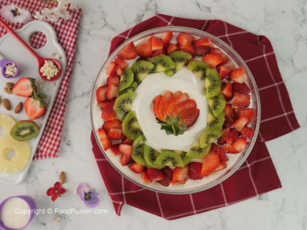 -Add olper’s whipped cream,strawberry puree,add strawberry,pineapple & kiwi slices.