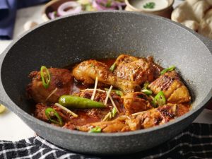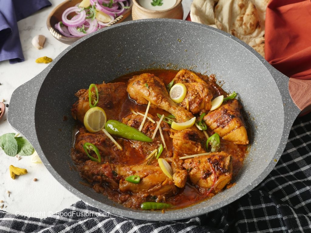 In a wok,add cooking oil,marinated chicken and cook on low flame for 12-15 minutes then cook on high flame for 2-3 minutes and turn sides in between.