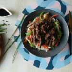 In serving dish,add cooked rice,stir fried vegetables,fried beef strips and drizzle prepared sauce and serve!