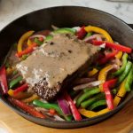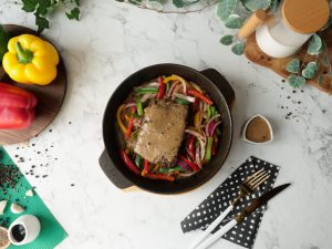 Stir fried vegetables aur beef steak rakh dein aur upper sa peppercorn sauce dal ker serve karein!
