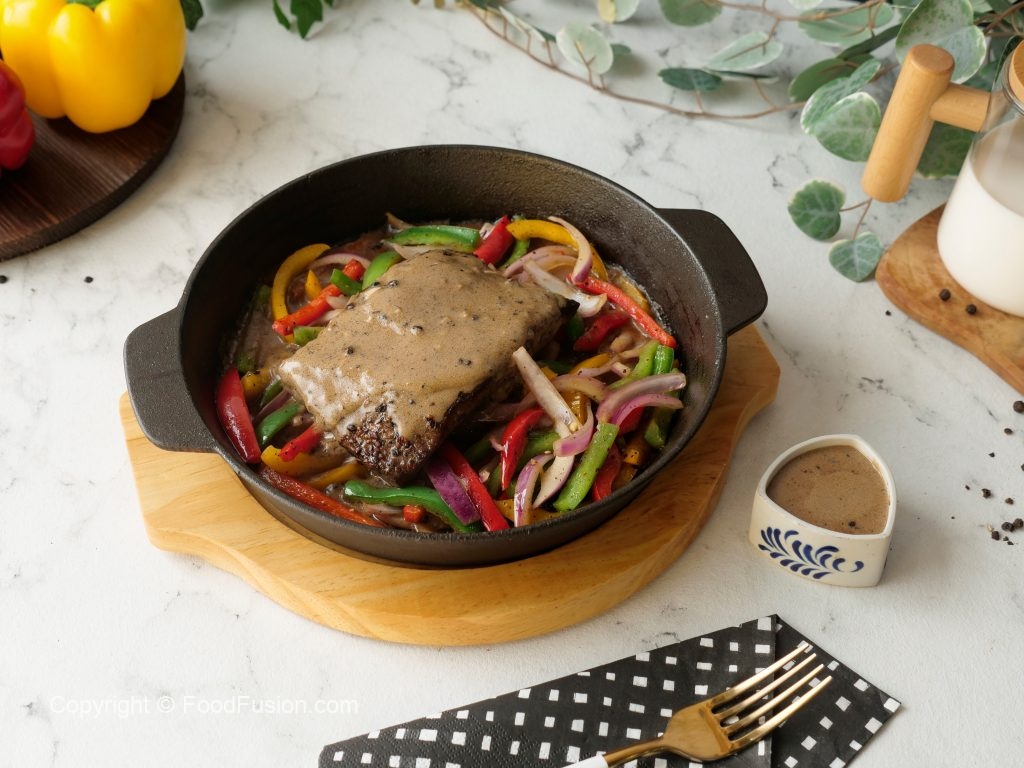 Add stir fried vegetables,beef steak and peppercorn sauce & serve!