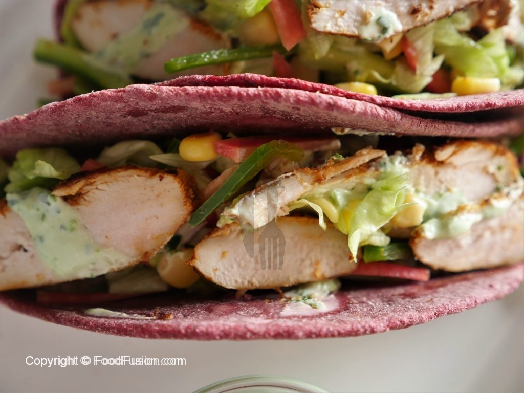 To assemble tacos,add salad,chicken slices,raita/green yogurt sauce & serve.