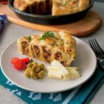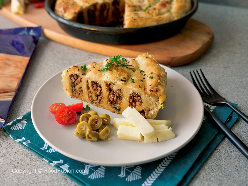 Clean working surface per maida chirak dein aur plain paratha rakh ker stretch ker ka square shape bana lein,egg & yogurt mixture ko brush ki madad sa laga lein aur cooked qeema (2-3 tbs) daldein aur roll ker ka tube bana lein.
