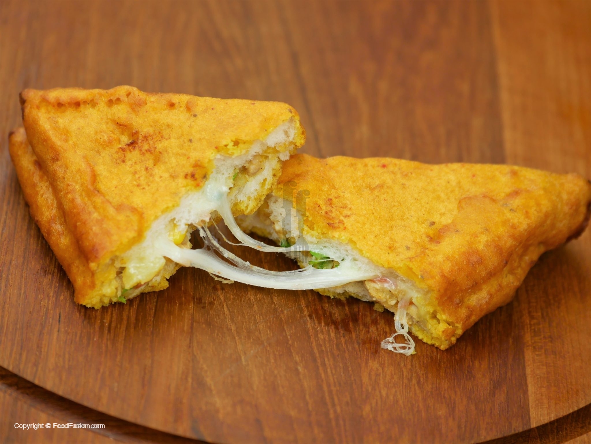 Stuffed bread slices ko triangular shape mein cut ker lein.