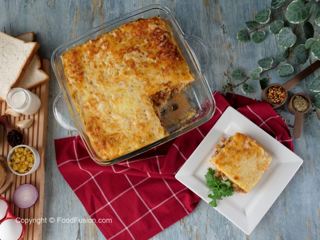 Baking dish mein tayyar white sauce dal ker pheela lein,bread slices rakh ker tayyar vegetable sauce,white sauce,cheddar cheese,mozzarella cheese,bread slices,red sauce,white sauce,cheddar cheese,mozzarella cheese,bread slices aur tayyar egg mixture dal ker upper sa cheddar cheese & mozzarella cheese dal dein