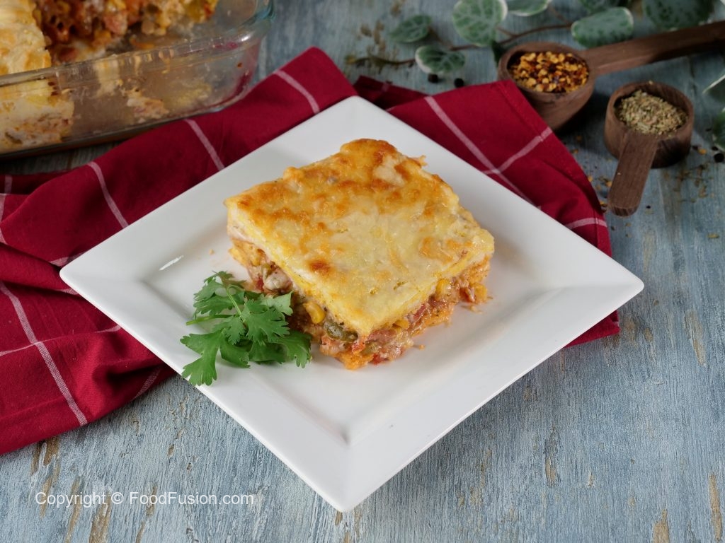 In a baking dish,add & spread prepared white sauce,bread slices,prepared vegetable sauce,white sauce, cheddar cheese,mozzarella cheese,bread slices,red sauce,white sauce,cheddar cheese,mozzarella cheese,bread slices,pour prepared egg mixture,cheddar cheese & mozzarella cheese.