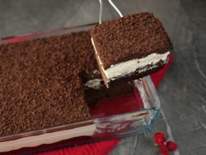 -On a serving dish,place chocolate brownie,add prepared olper’s whipped cream & spread evenly.