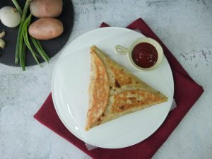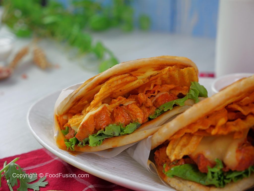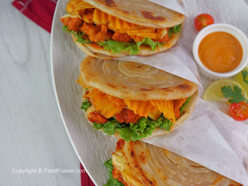 -On paratha,add prepared butter chicken sauce,salad leaves,chicken filling with cheese,chips,prepared butter chicken sauce & cover with another paratha (makes 4) & serve!