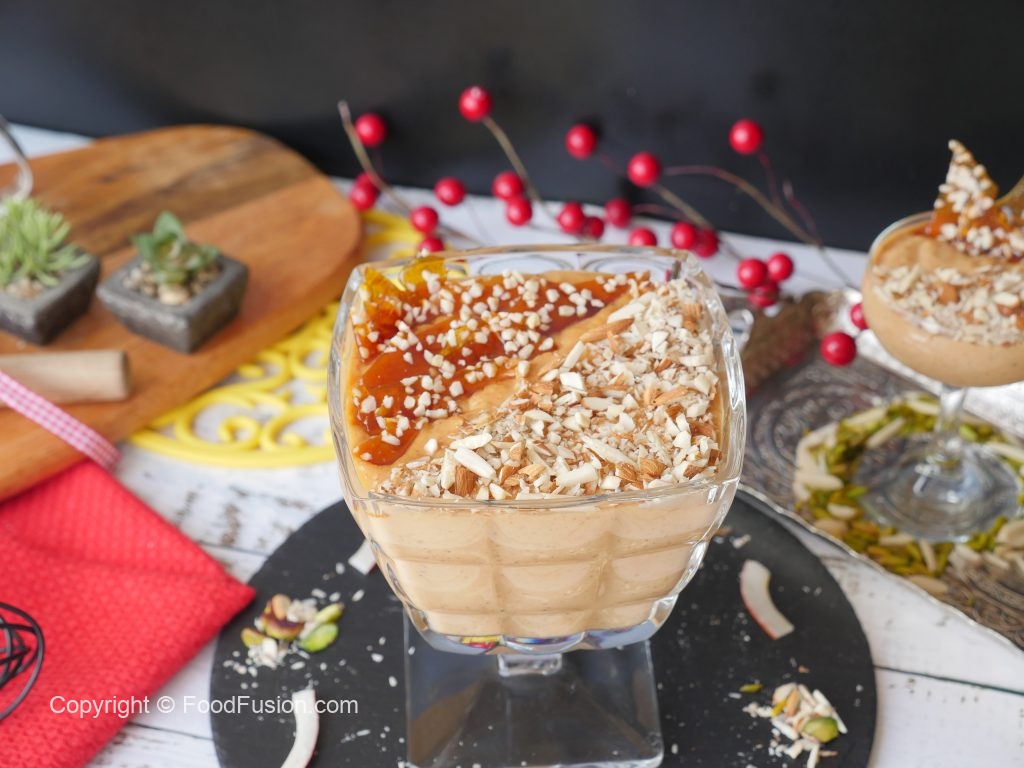 Serving dish mein caramel firni dal dein,badam aur caramel crunch sa garnish ker ke serve karein!