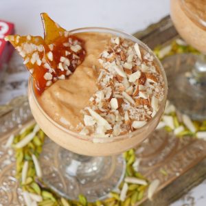 In serving dish,add caramel firni,garnish with almonds,caramel crunch & serve!