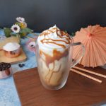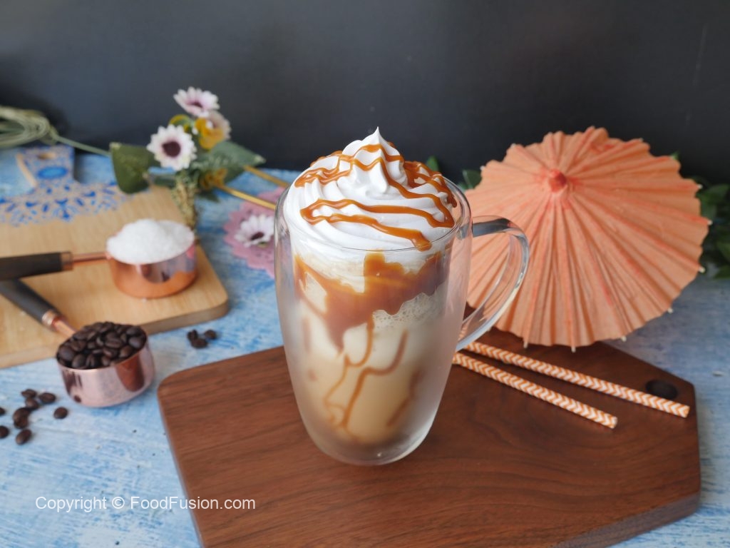 Serving glass k sides pe caramel sauce daalen or caramel Frappuccino glass may nikal len.