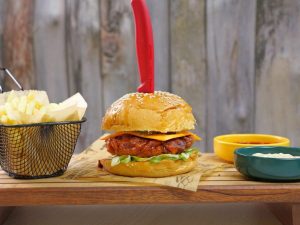 On a burger bun,add & spread green chilli sauce,add tomato,cucumber,fried patty,jalapeno slices & drizzle tamarind sauce.