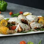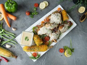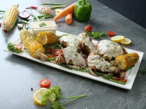 -Serving platter per grilled vegetables,chicken tikka pieces aur grilled corns rakh dein.