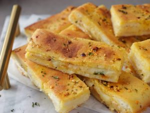 -Tayyar garlic butter laga ker sticks mein cut ker lein.