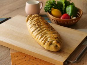 Brush ki madad sa anda+doodh ko braided bread per laga lein aur kalay til chirak lein.