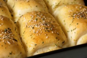 Grease 7.5 x 11” baking pan with prepared herbed butter,place dinner rolls and cover & let it proof for 20-25 minutes.