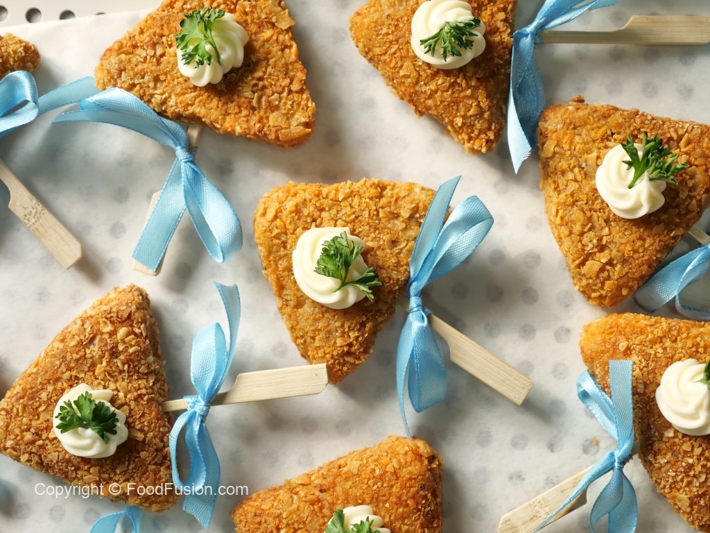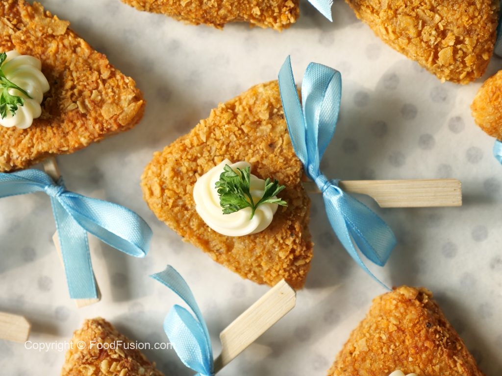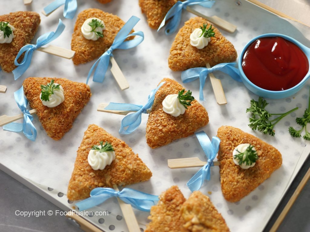 -Now coat with all-purpose flour then dip into whisked eggs & coat with nachos (makes 30-32).
