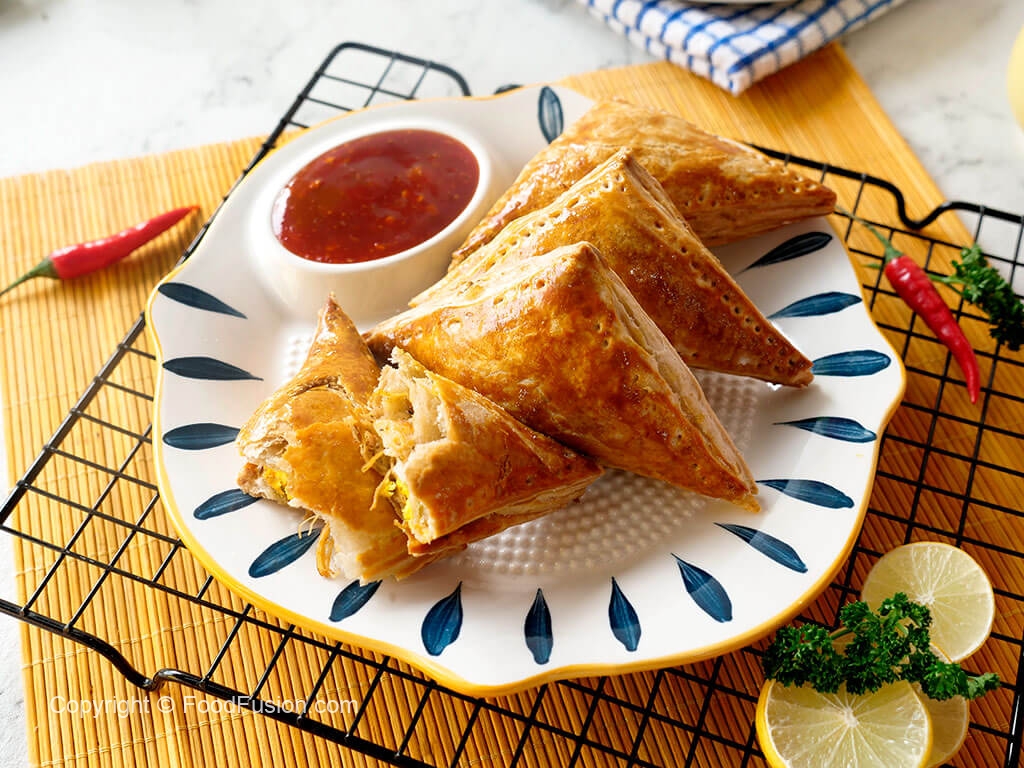 On each puff pastry square,add prepared filling & egg wedge in the center (skip egg if storing),apply water on the edges,flip the other side & press the edges to stick together and prick with fork to seal the edges (makes 18).