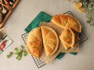 -On baking try (greased with cooking oil and lined with butter paper),place rolled dough,on half side of the dough,add chicken filling,apply water and fold the other side over it,press and apply water and seal the edges.