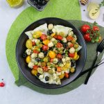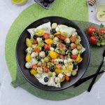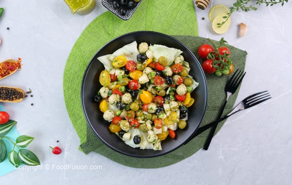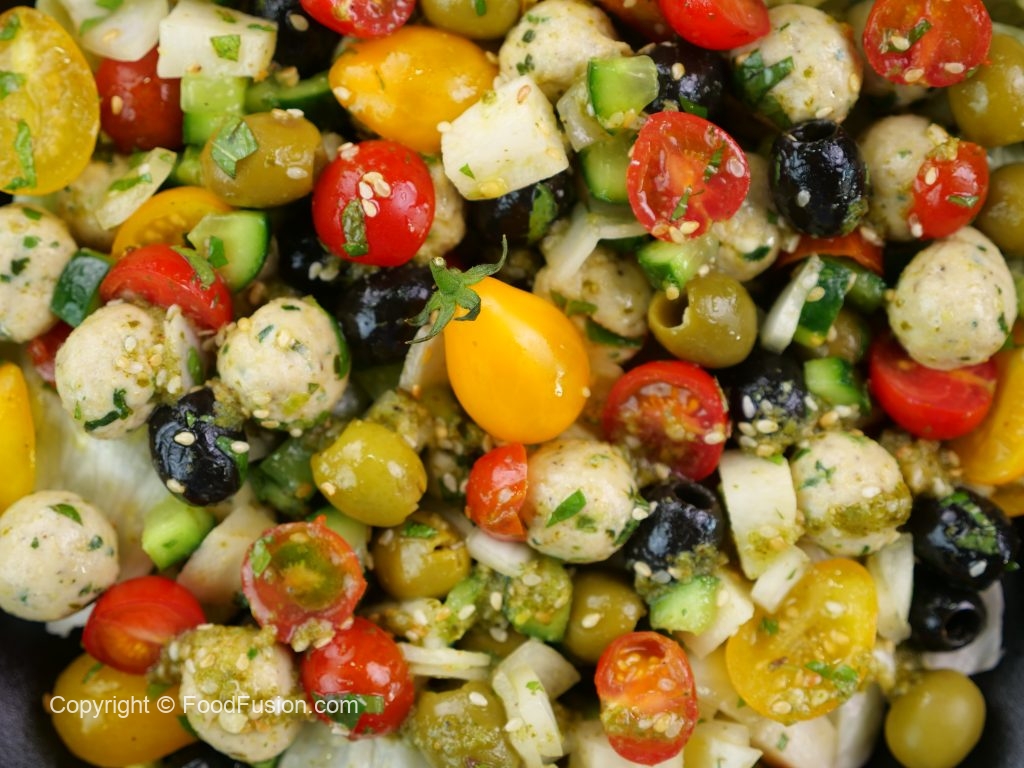 -In a bowl,add iceberg lettuce,prepared mini chicken kafta (approx. 30),black olives,green olives,cucumber,reddish, onion,yellow cherry tomatoes,red cherry tomatoes,fresh coriander,2-3 tbs of prepared gm salad dressing & give it a good mix.