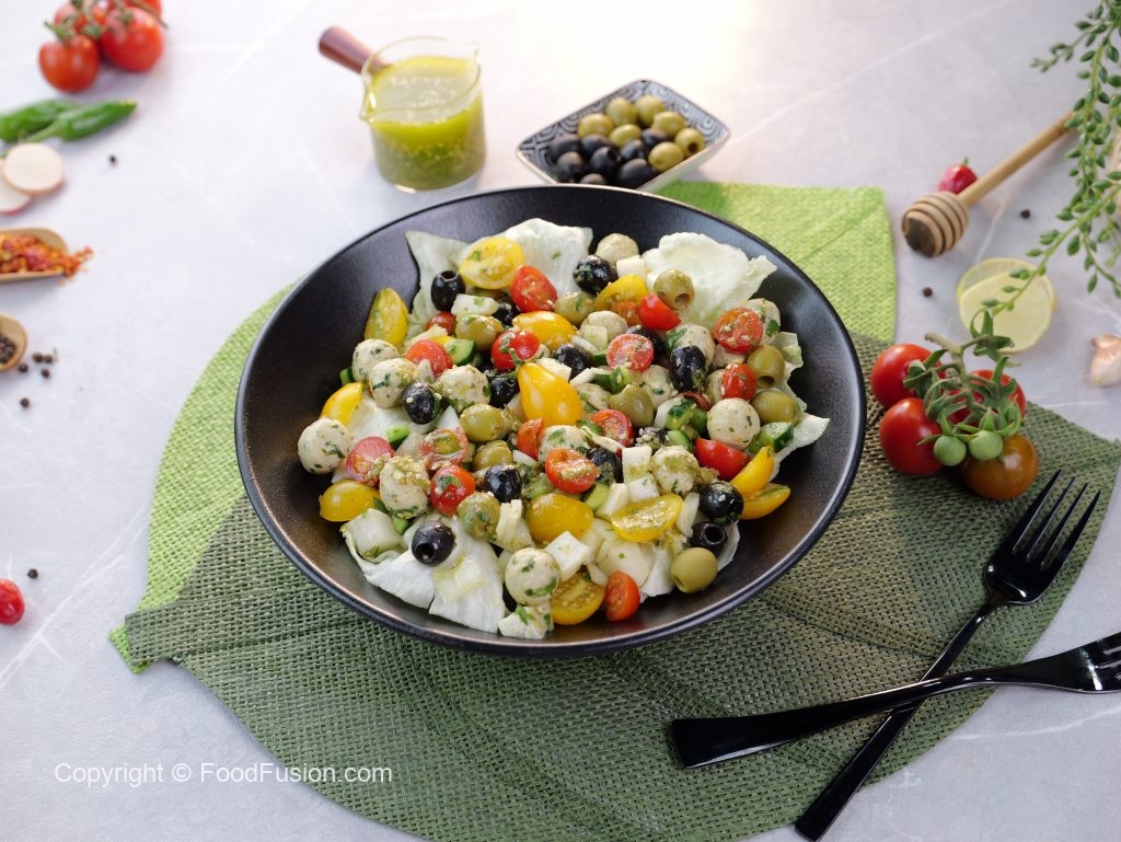 -Bowl mein iceberg lettuce,tayyarnmini chicken kafta (approx. 30),black olives,green olives, kheera,mooli,pyaz,yellow cherry tomatoes,red cherry tomatoes,hara dhania aur 2-3 tbs tayyar gm salad dressing dal ker ache tarhan mix ker lein.