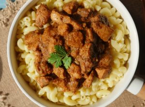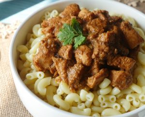 On serving plate,add boiled macaroni,korma masala & serve!