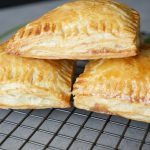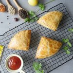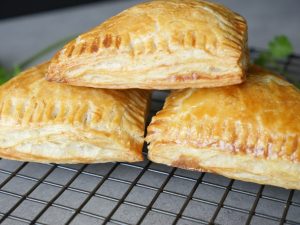Add & spread chicken filling,place another paratha part,repeat the same layer and seal edges with fork & apply egg wash (makes 12).