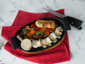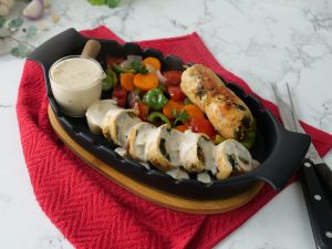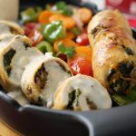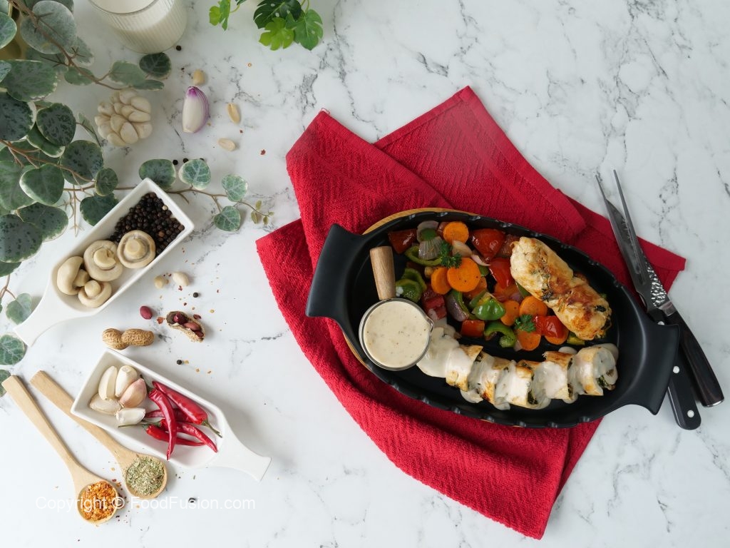 Drizzle cheese mushroom sauce on chicken roulades & serve with grilled vegetables & cheese sauce!