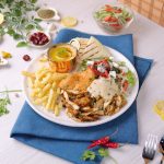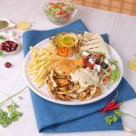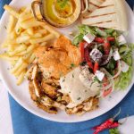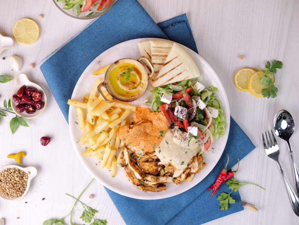 -On serving plate,add hummus,iceberg lettuce,salad,poatao fries,shawarma chicken slices,feta cheese,white sauce,red sauce,lemon juice,sumac powder,fresh parsley,pita bread & serve!
