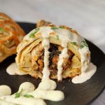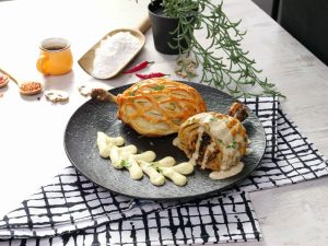 -Serve chicken wellington with mustard brown sauce & mash potatoes.