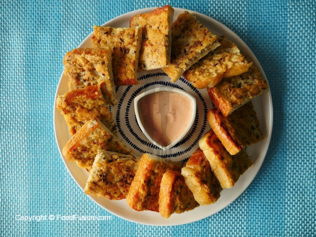 In frying pan, add oil and place bread slices (spread side downwards) and fry for 4-5 minutes on low flame.