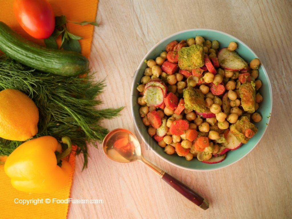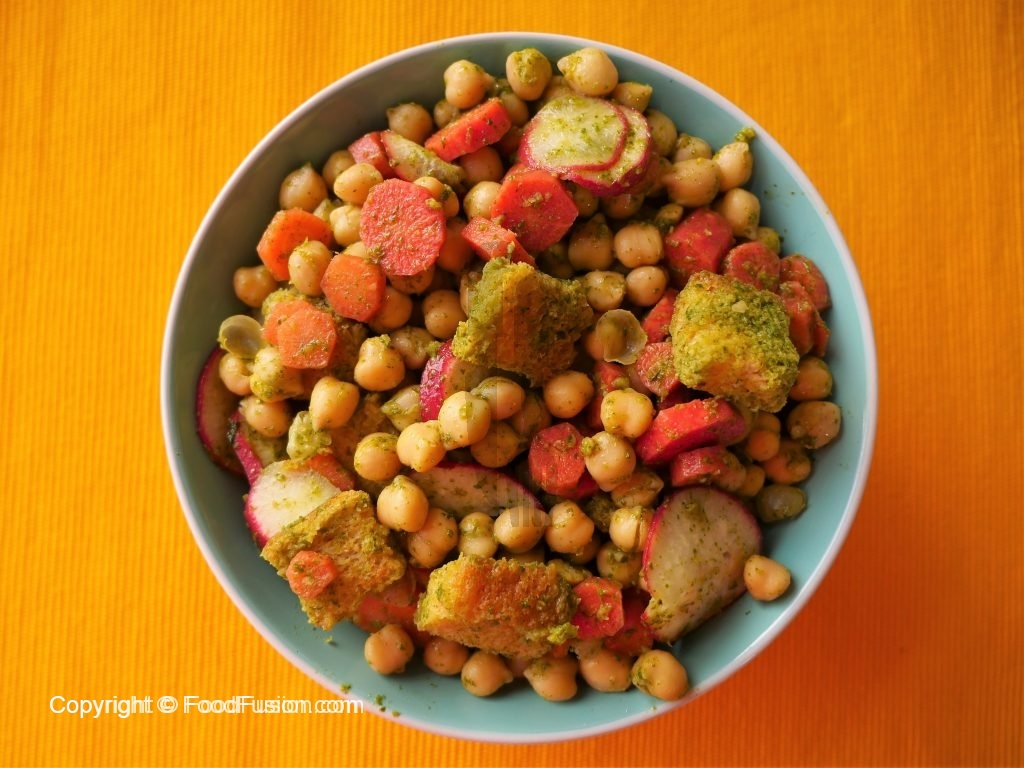 In bowl,add chickpeas,carrot,radish,toasted bran bread cubes and drizzle green sauce dressing,mix well & serve.