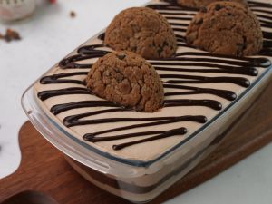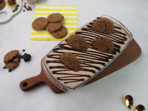 -Add a layer of soaked choco lava biscuits & chocolate custard cream.
