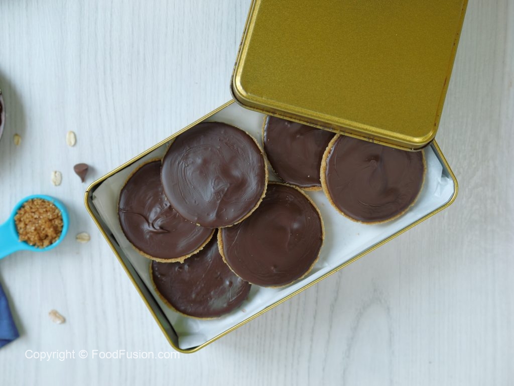 -Spread melted chocolate on one side of biscuits & let it set at room temperature (makes 28).