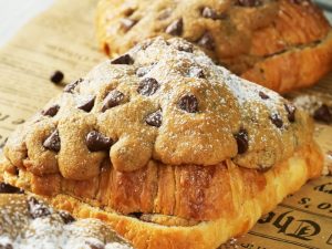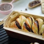 -Spread chocolate spread on rolled dough & flip one end over the other.