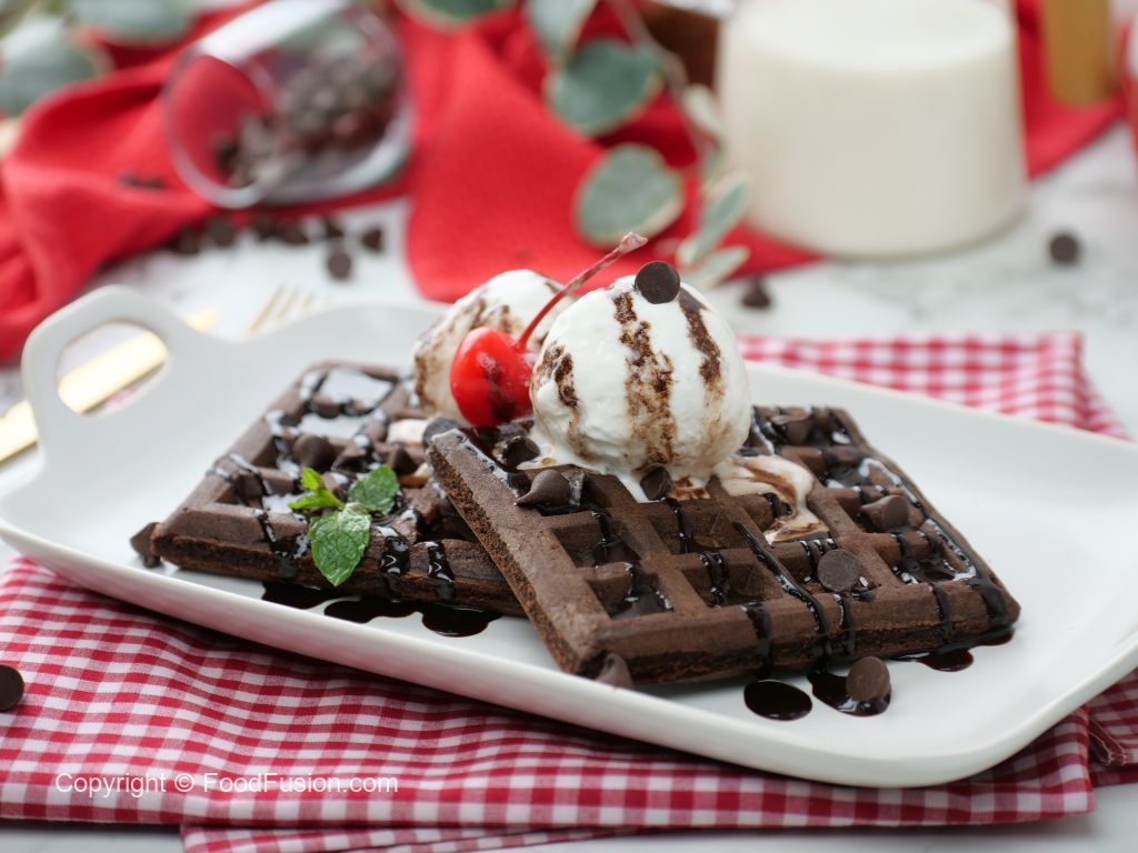 -Chocolate waffles per vanilla ice cream,tayyar chocolate sauce & chocolate chips dal dein,cherry & mint leaves sa garnish ker ka serve karein.