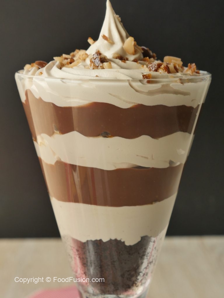 In serving glass,add crumbled brownie,coffee whipping cream,crushed coffee candy,prepared chocolate custard,coffee whipping cream and crushed coffee candy.