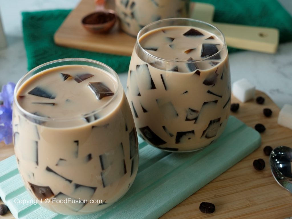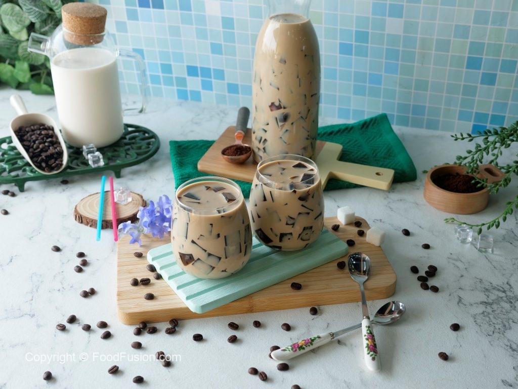 Serving glass mein tayyar coffee jelly aur tayyar cold coffee dal ker stir ker lein & serve karein!