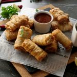 Add prepared creamy chicken filling and apply flour slurry then fold the sides and roll sheet to make samosa (makes 18-20).
