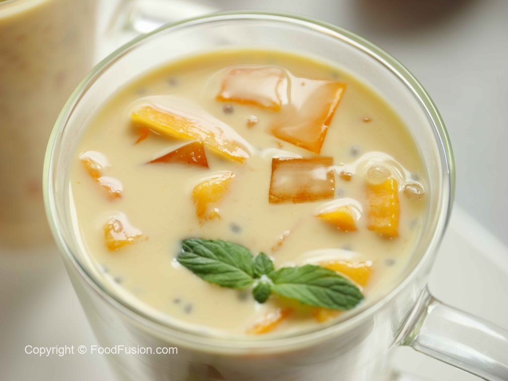 -Ek bowl mein mango puree,boiled sagu dana,mango cubes, soaked tukhme balanga,mango jelly,tayyar creamy milk aur ice cubes dal kar mix ker lein aur serve karein!