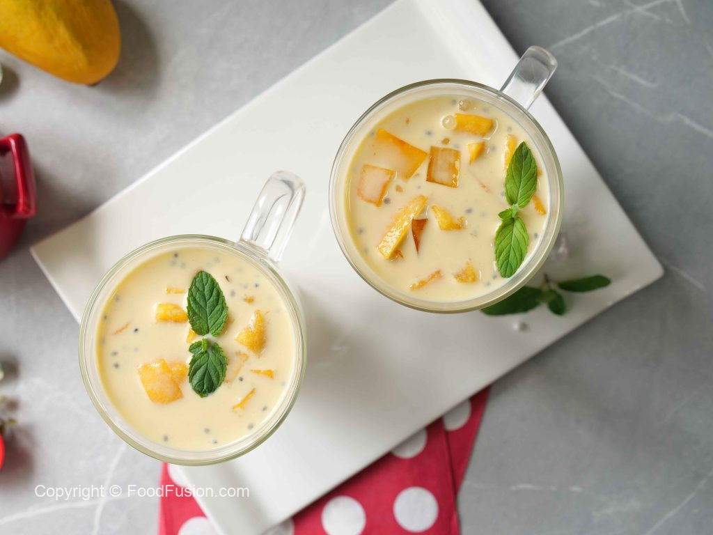 -In a bowl,add mango puree,boiled tapioca sago,mango cubes,soaked basil seeds,mango jelly,prepared creamy milk,ice cubes,mix well & serve!
