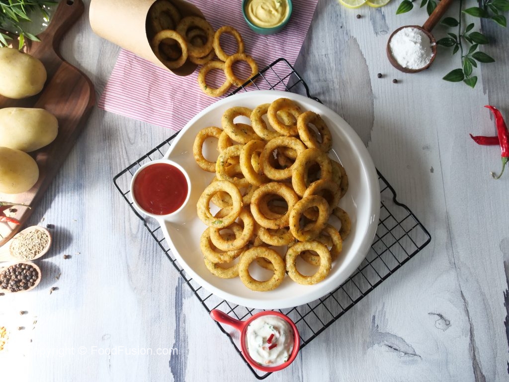-Frying pan mein cooking oil garam karein aur potato rings ko darmiyani ancch per golden ho janay tak fry ker lein.